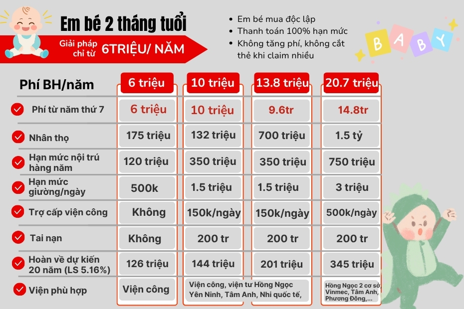Giải pháp minh họa cho em bé 2 tháng tuổi với 3 mức phí từ nhỏ đến cao, từ nhu cầu nằm viện công, viện tỉnh đến viện tư nhân chi phí cao như Tâm Anh, Vinmec, Hồng Ngọc,…