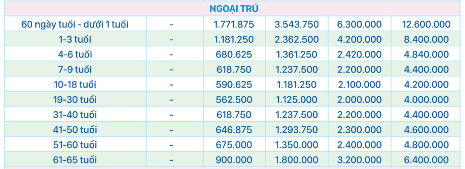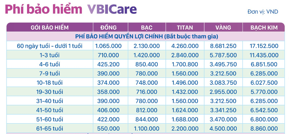 Khi tìm hiểu bảo hiểm VBI cho bé, phần lớn ba mẹ quan tâm hai quyền lợi: Quyền lợi chính và thêm quyền lợi ngoại trú bổ sung. Dưới đây là biểu phí cho 2 quyền lợi trên.