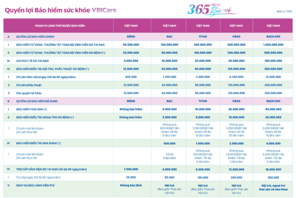 Các chương trình: Có 5 chương trình từ Đồng, Bạc, Titan, Vàng, đến Bạch Kim, tùy thuộc vào nhu cầu bảo vệ và khả năng tài chính của gia đình.